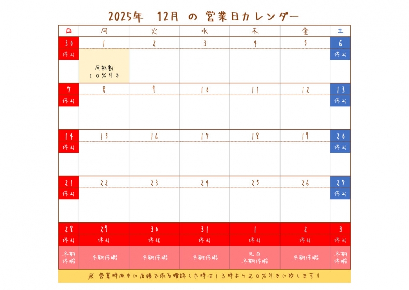 雨を店頭で確認した時は13時より「雨割」として20%引きさせていただきます~